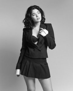 📝 Descripción extendida: Jocelyn Corona, modelo e influencer mexicana, posa provocadora con un conjunto de lencería negra en interiores elegantes.