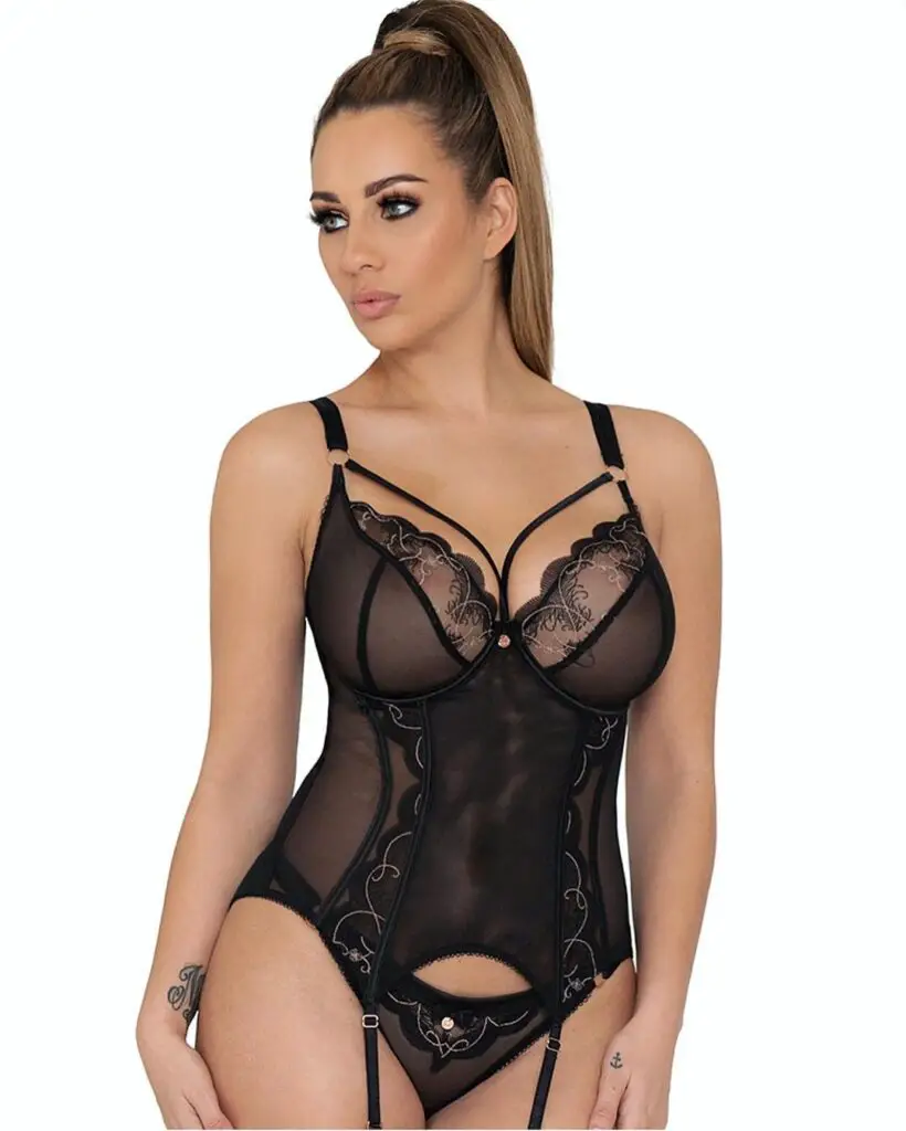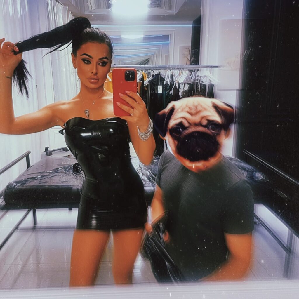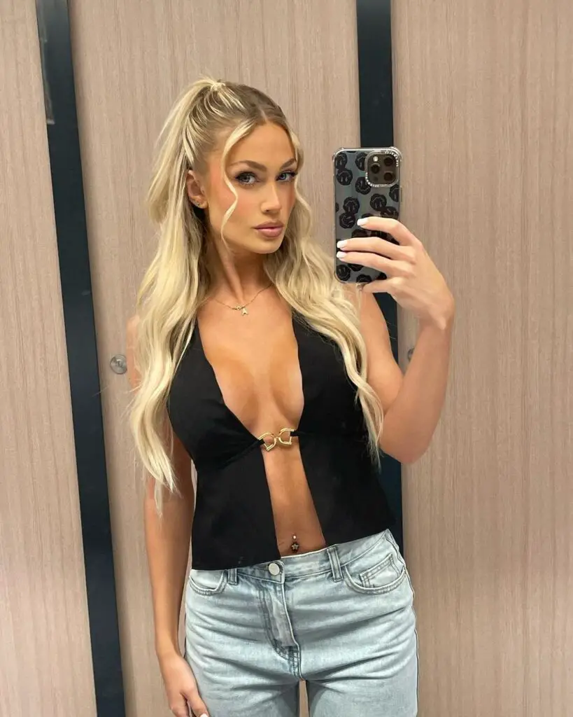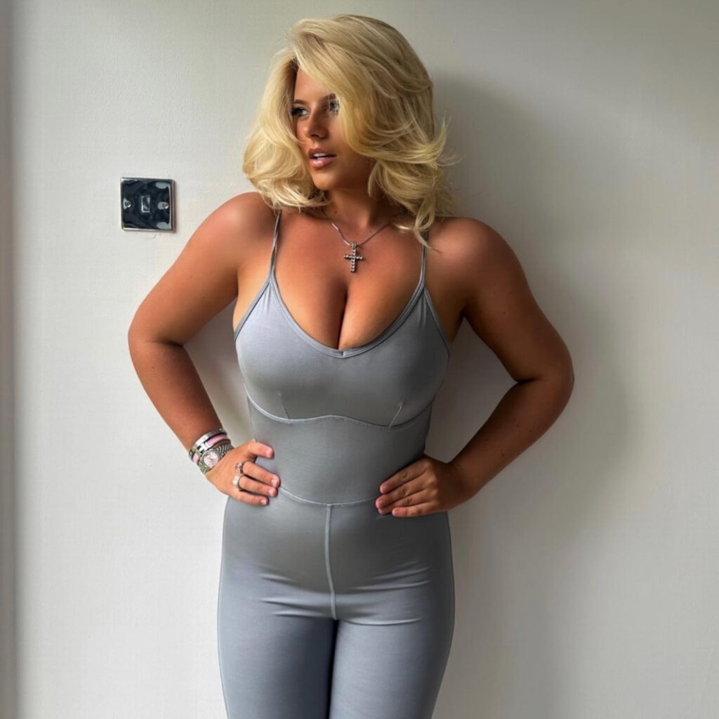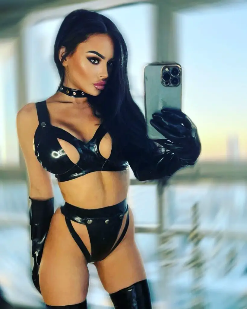 sammybraddy deslumbra en un corsé rojo que resalta su figura.