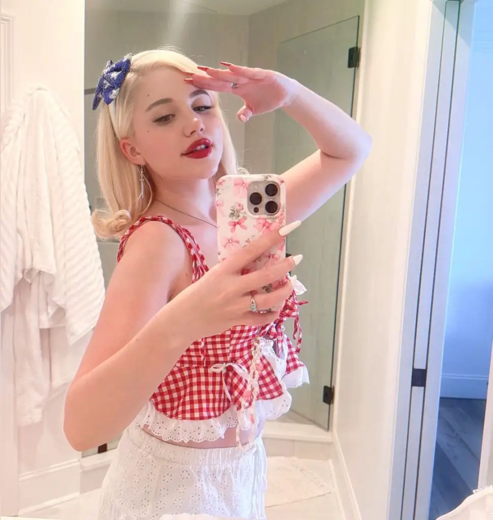 Alida Simone celebra el estilo patriótico con un top de cuadros y labios rojos.