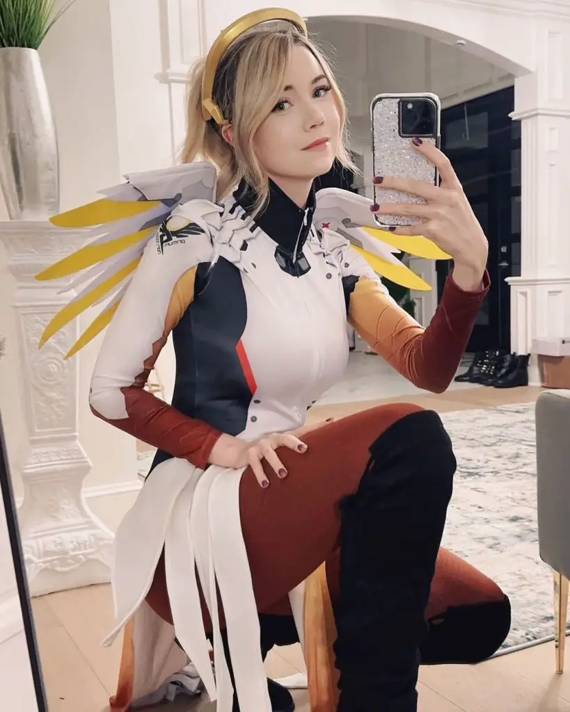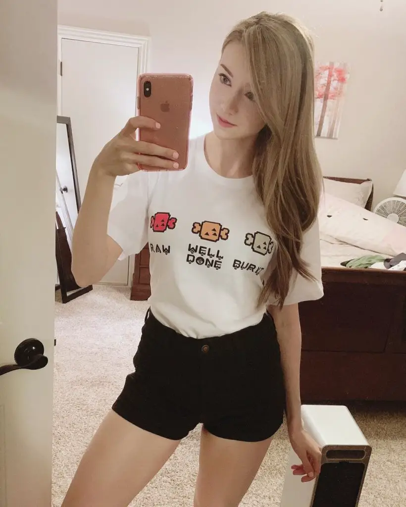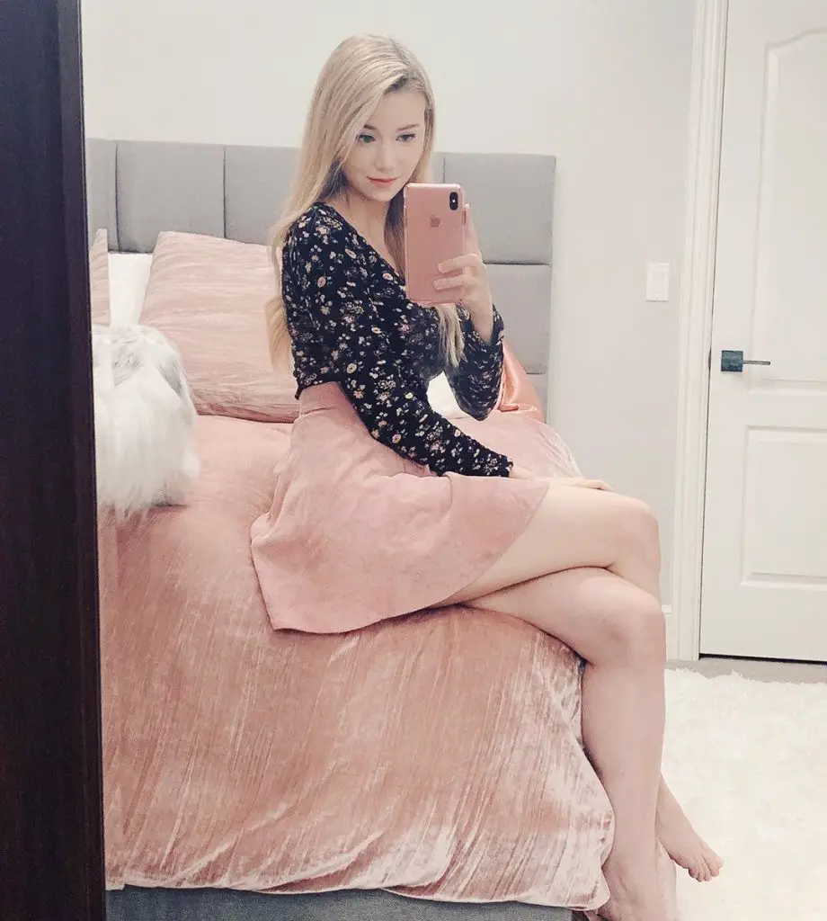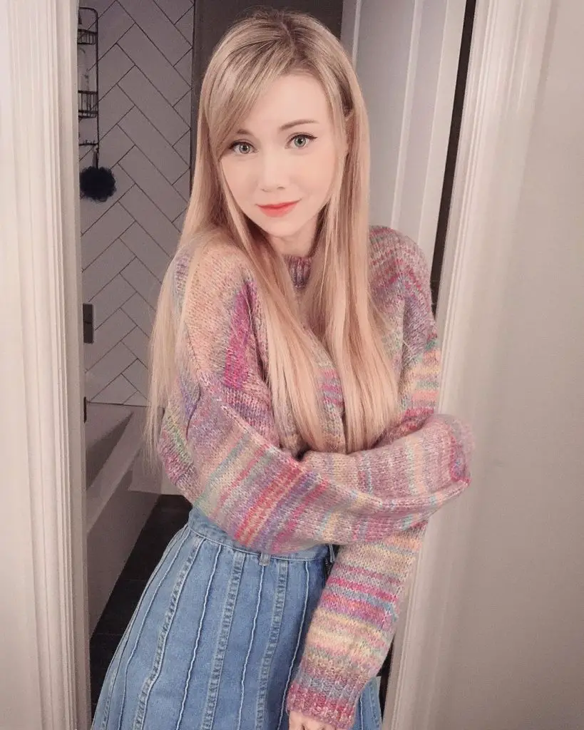 PeachJars en cosplay de colegiala con falda blanca y top rosa.