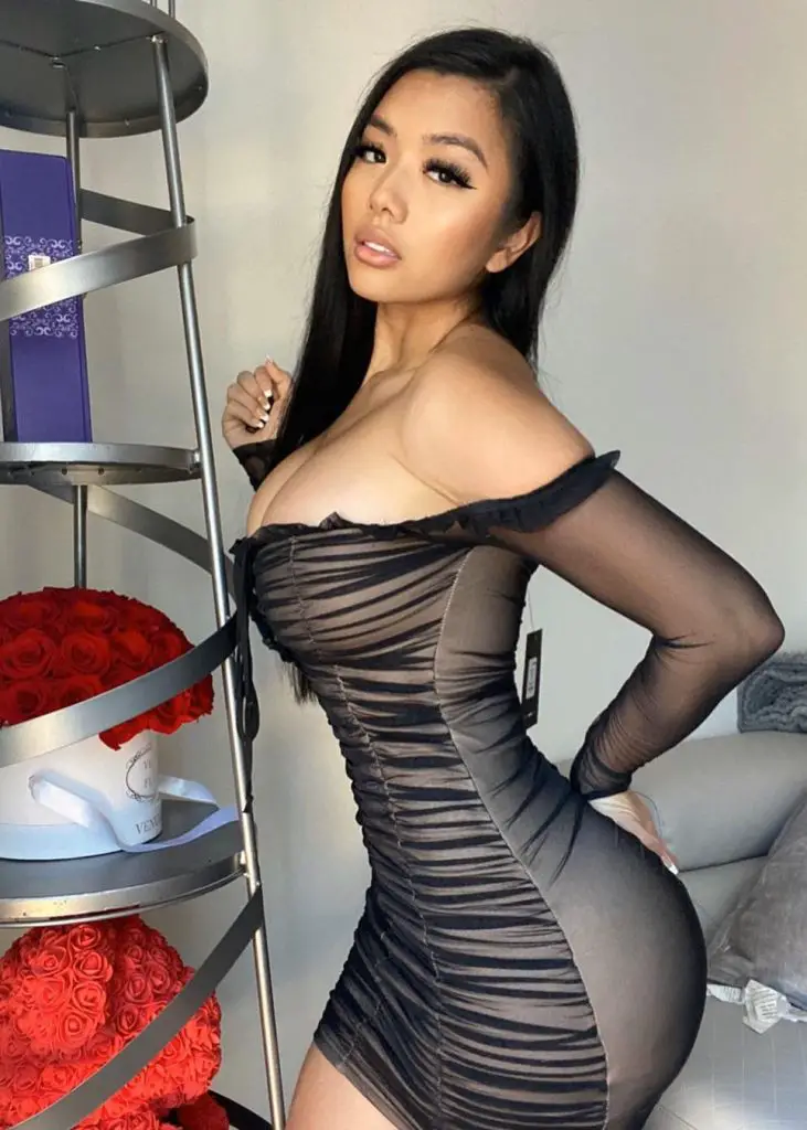 Micaela Ari Demonmika en un vestido de red negro, luciendo provocadora y resaltando sus curvas