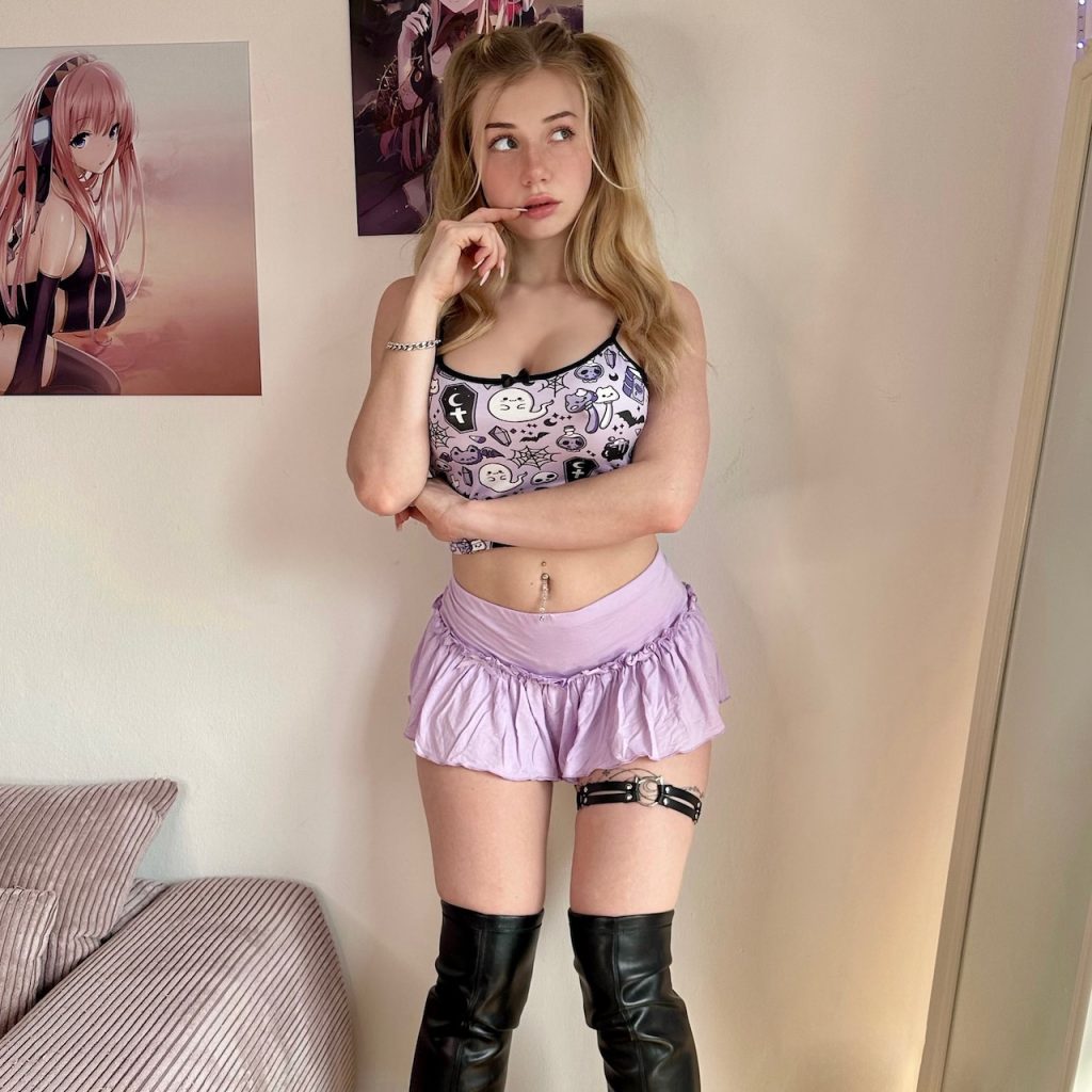 Lanawaifu deslumbra en mini falda lila y botas negras