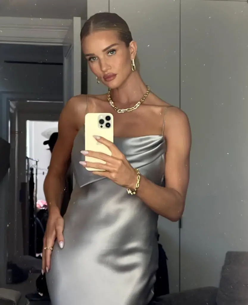 Rosie Huntington deslumbra con elegante vestido de seda plateado
