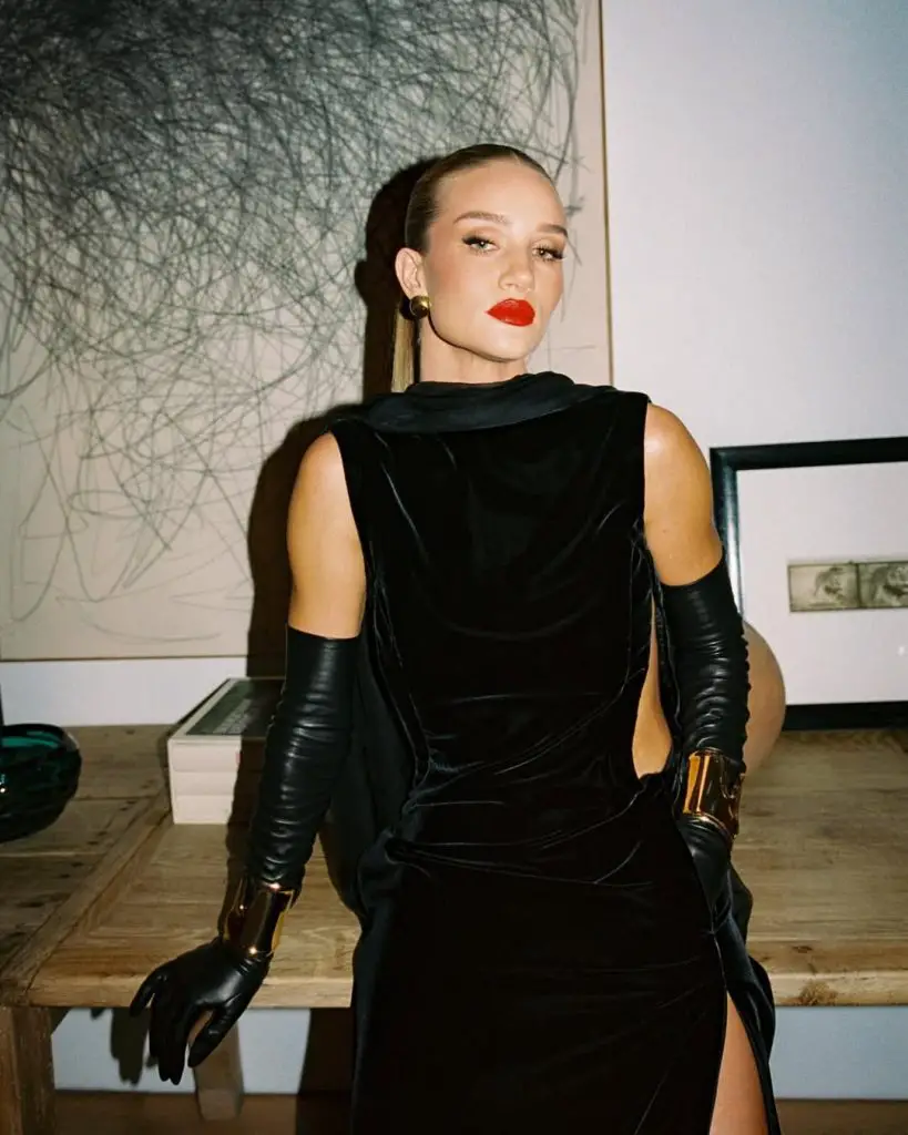 Rosie Huntington impresiona con elegante vestido negro y destellante accesorio
